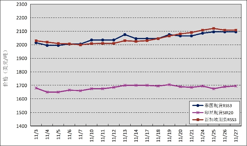 國(guó)外主產(chǎn)區(qū):11月,泰國(guó)RSS3平均價(jià)格2048美元/噸,環(huán)比上漲6美元/噸,最高價(jià)2095美元/噸,最低價(jià)1995美元/噸;印尼SIR20平均價(jià)格1683美元/噸,環(huán)比下跌9美元/噸,最高價(jià)1705美元/噸,最低價(jià)1650美元/噸;新加坡RSS3期貨主力合約月均結(jié)算價(jià)格2047美元/噸,環(huán)比上漲26美元/噸,最高價(jià)2120美元/噸,最低價(jià)1999美元/噸。