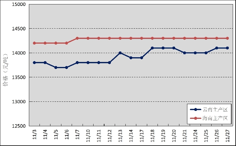 國(guó)內(nèi)主產(chǎn)區(qū):11月,云南產(chǎn)區(qū)生產(chǎn)較為穩(wěn)定,原料正常釋放,海南產(chǎn)區(qū)天氣狀況改善,原料價(jià)格波動(dòng)不大。云南、海南鮮膠乳(折干膠)月均價(jià)格分別為13921元/噸、14279元/噸,環(huán)比分別上漲98元/噸、526元/噸。