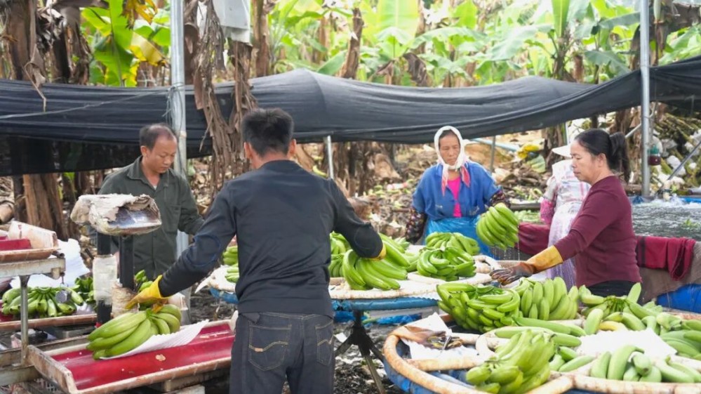 分揀大棚內(nèi),十余名工人分工協(xié)作,將大串香蕉分割成小份后用清水仔細(xì)沖洗果皮上的雜質(zhì),挑出品相不佳的次品,熟練地為合格香蕉套上保鮮袋、裝入紙箱中。剛裝箱的香蕉通體翠綠,散發(fā)著清新草木香,而一旁單獨(dú)擺放的幾串熟蕉,已染上誘人的金黃色。大棚外,來(lái)自東北的收購(gòu)商早已等候多時(shí),對(duì)著豐收的果實(shí)滿(mǎn)臉笑意。
