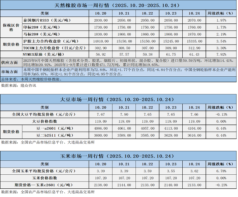 天然橡膠、大豆、玉米市場一周行情(2025.10.20-10.24)