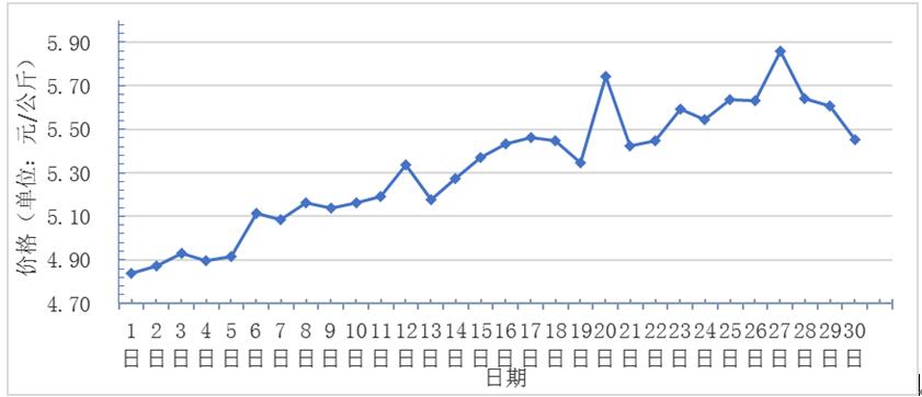 11月,全國重點(diǎn)監(jiān)測農(nóng)產(chǎn)品批發(fā)市場香蕉總交易量達(dá)9萬噸,同比上漲8.4%,環(huán)比下降2.2%;總交易價(jià)值 48607.5萬元,同比上漲35.1%,環(huán)比上漲14.1%。日平均價(jià)格最高為5.9元/千克,最低為4.8元/千克,全月平均價(jià)格為5.3元/千克,同比上漲12.8%,環(huán)比上漲6%(每日價(jià)格變化如圖)。