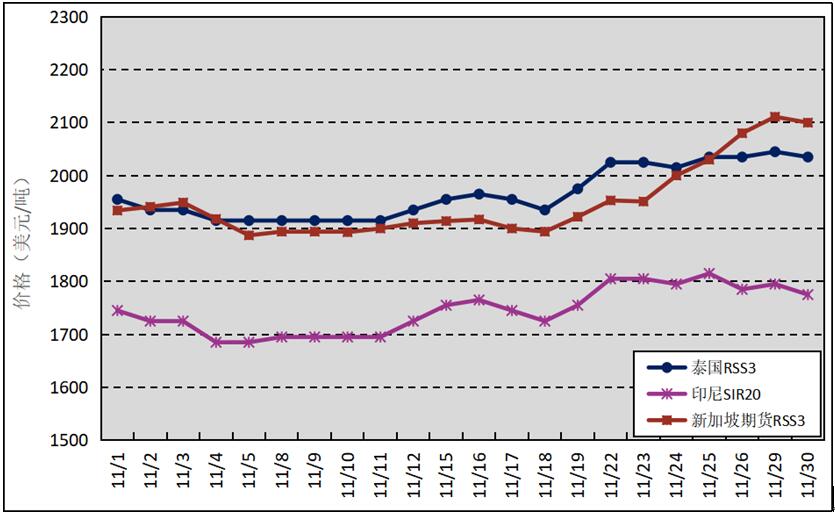 國外主產(chǎn)區(qū):11月,泰國RSS3平均價格為1966美元/噸,環(huán)比上漲42美元/噸,最高價為2045美元/噸,最低價為1915美元/噸;印尼SIR20平均價格為1745美元/噸,環(huán)比下降20美元/噸,最高價為1815美元/噸,最低價為1685美元/噸;新加坡RSS3期貨主力合約月均結(jié)算價格為1950美元/噸,環(huán)比上漲34美元/噸,最高價為2111美元/噸,最低價為1887美元/噸。