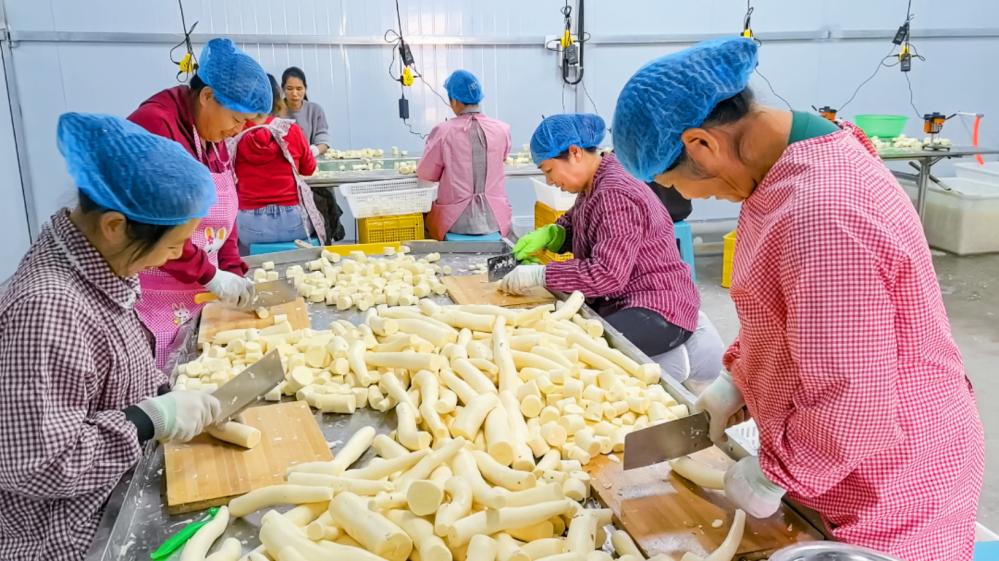 位于20公里外的木薯加工廠同樣熱鬧,滿載新鮮木薯的貨車駛?cè)牒?,工人們迅速分揀、去皮、切塊去芯,經(jīng)真空包裝后送入冷庫(kù)待發(fā)。