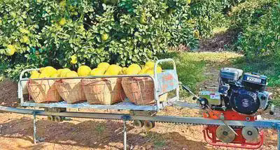 南福金柚種植基地,單軌山地果園運(yùn)輸機(jī)正在工作中。