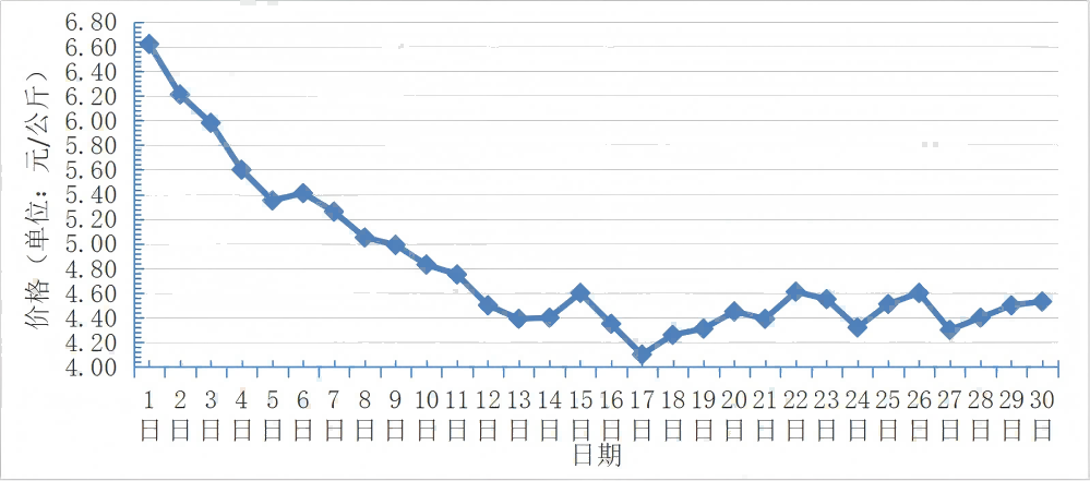 11月,全國重點(diǎn)監(jiān)測農(nóng)產(chǎn)品批發(fā)市場香蕉總交易量達(dá)2.2萬噸,同比下降8.3%,環(huán)比下降4.3%;總交易價(jià)值10895.6萬元,同比下降24.6%,環(huán)比下降12.1%。日平均價(jià)格最高為6.6元/千克,最低為4.3元/千克,全月平均價(jià)格為4.7元/千克,同比下降24.9%,環(huán)比下降2.1%(每日價(jià)格變化如圖)。