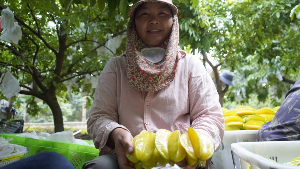 來自成都的旅居游客邱阿姨和同伴也被香甜誘人的楊桃吸引,直接進到地里購買?!霸喼笔侨碎g寶藏!水果又多又好。上次來那路村游玩,品嘗到黃澄澄的楊桃,就一直記著這個味道,這次就迫不及待直接來地里回購!這些楊桃?guī)Щ厝?,家里人肯定高興?!鼻癜⒁桃贿呎f一邊挑選著楊桃。刀紹沙則幫顧客分揀、包裝好,并叮囑存放竅門。